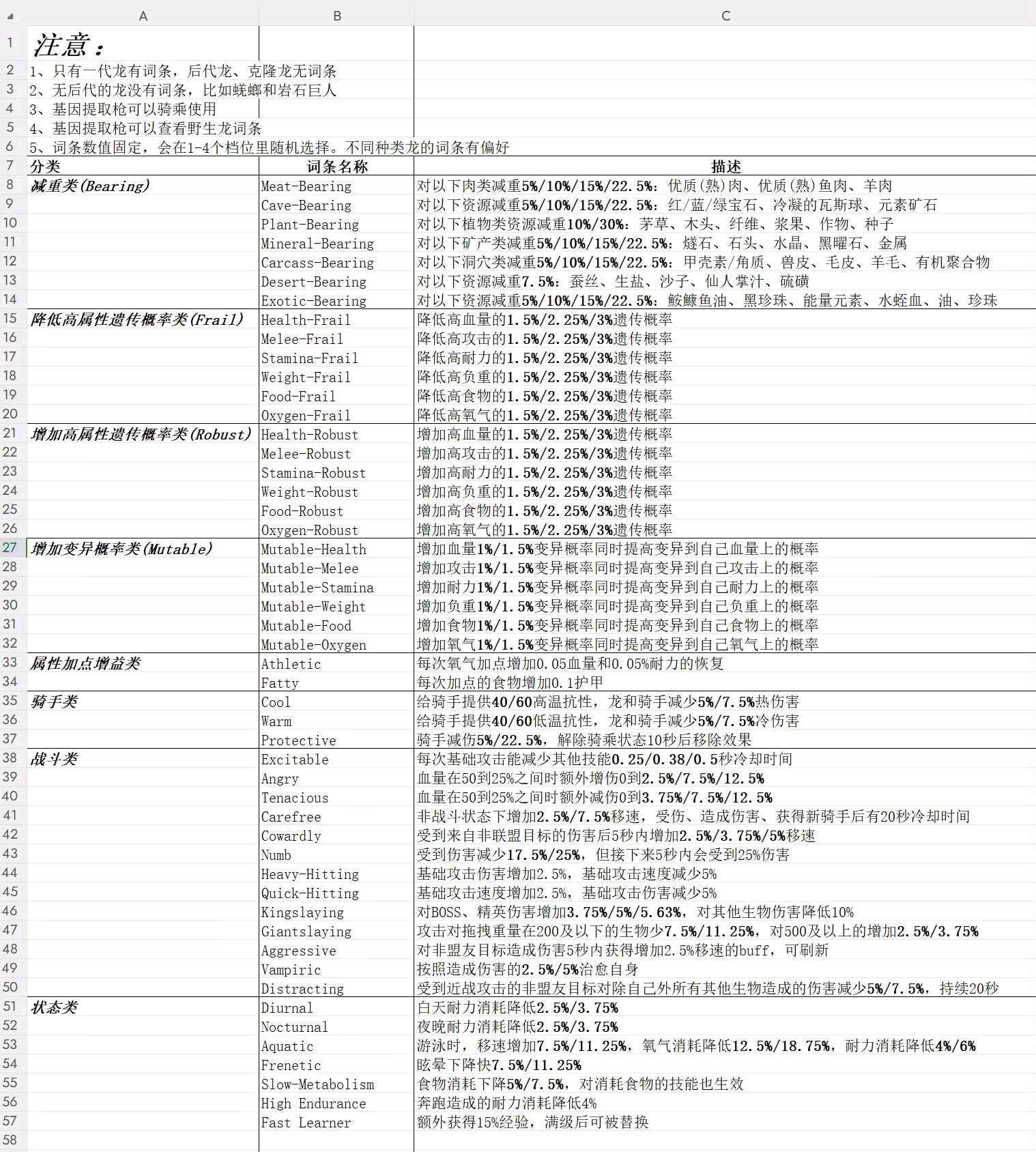 这4个效果只能对生命、耐力、氧气、食物、负重、攻击这6个属性中的一种生效,也就说这4个基因其实有24个不同品种,对战斗没有帮助,但培育出精品变异龙变得轻松很多。